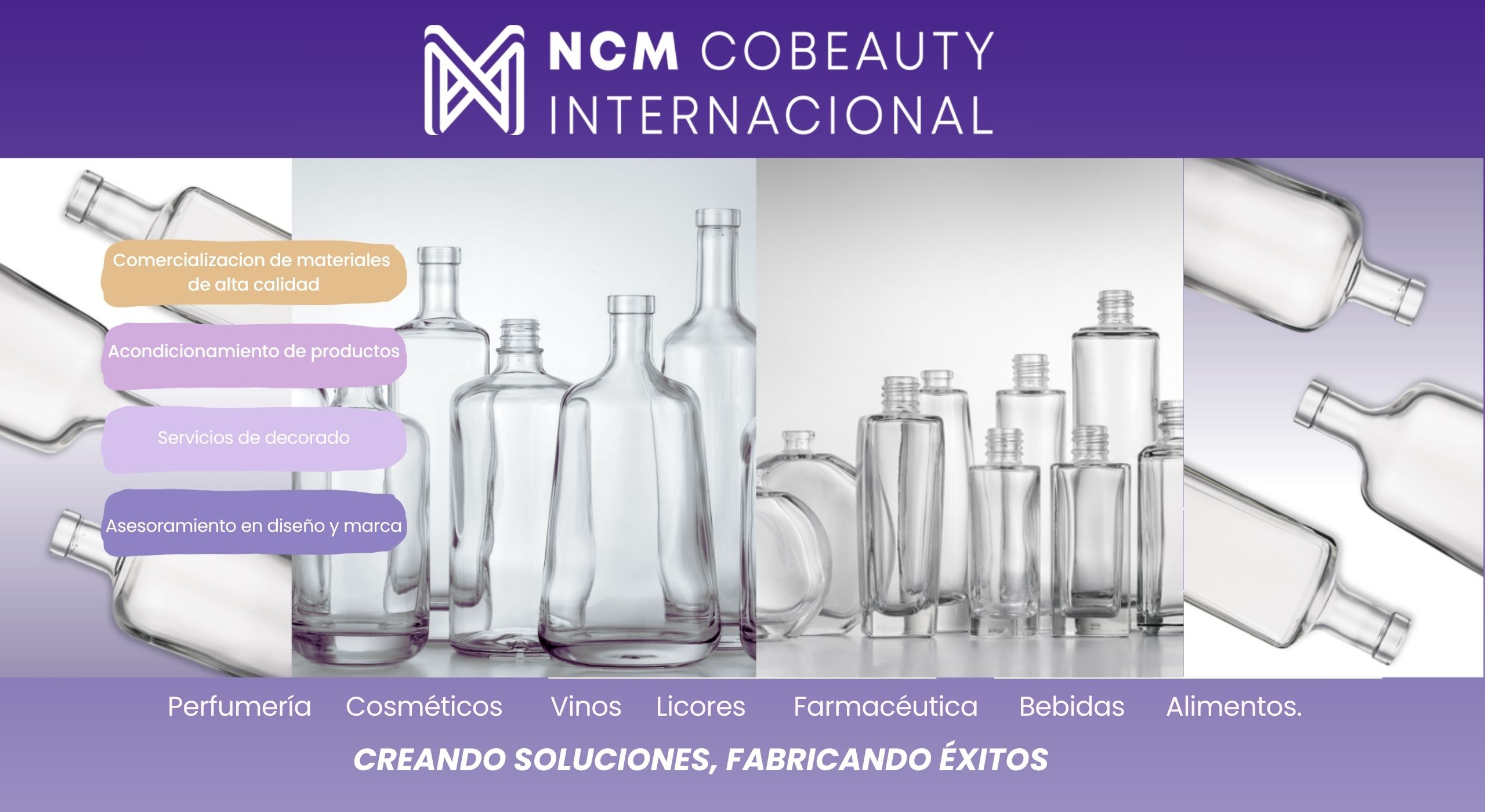 Nuestros servicios: Desarrollo de productos innovadores. Asesoramiento en diseño y marca. Suministro de materiales de alta calidad (vidrio, plástico, componentes). Acondicionamiento de productos (maquila, decorados). Servicios de decorado (serigrafia, pintado, mateado, metalizado. etc)